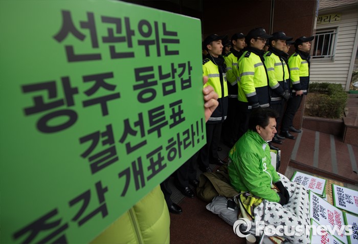(서울=포커스뉴스) 국민의당에서 공천 탈락한 정용화 전 광주유니버시아드 조직위원회 부위원장이 22일 오전 서울 마포구 국민의당 당사 앞에서 경선 결과에 부당함을 호소하는 시위를 하고 있다.