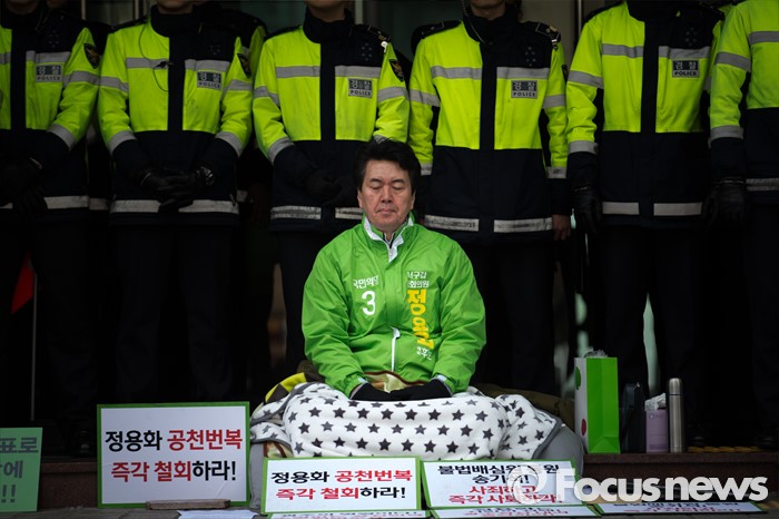 (서울=포커스뉴스) 국민의당에서 공천 탈락한 정용화 전 광주유니버시아드 조직위원회 부위원장이 22일 오전 서울 마포구 국민의당 당사 앞에서 경선 결과에 부당함을 호소하는 시위를 하고 있다.
