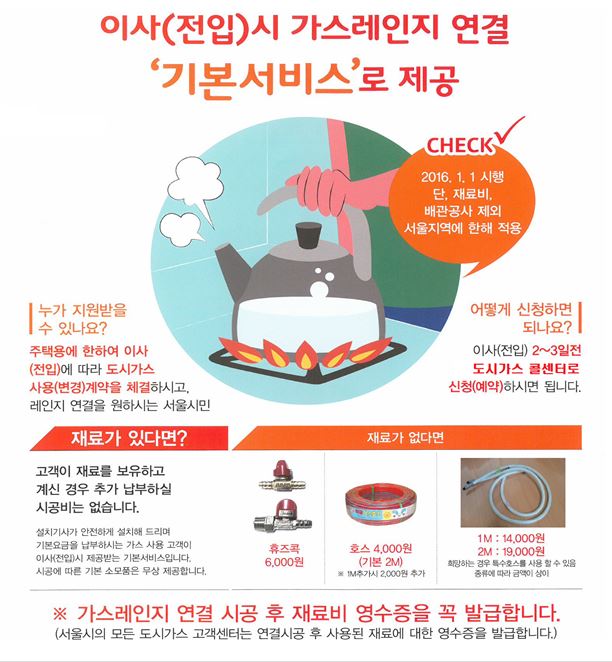 '이사(전입)가구에 대한 가스레인지 연결시공비 무료화 서비스'는 3만원 내외였던 연결비용 중 재료비만 이사 가구가 부담하고 나머지 연결비용은 면제해주는 서비스다.