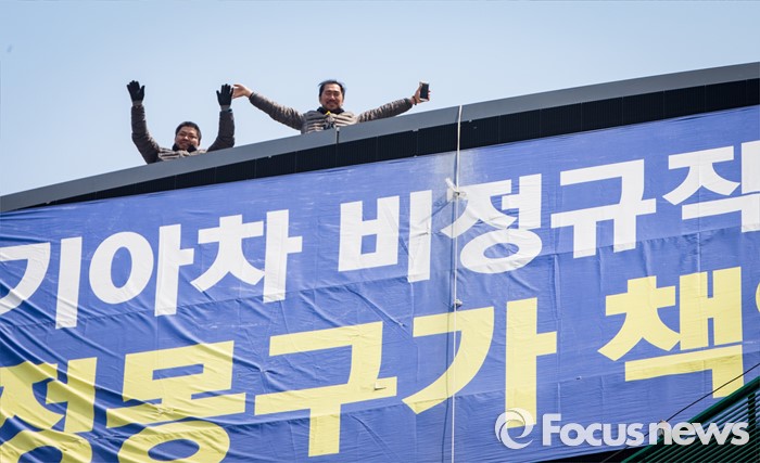 (서울=포커스뉴스) 22일 오전 서울광장 맞은편 구 인권위원회 건물 옥상 광고탑에서 고공농성을 284일째 이어가고 있는 기아차 사내하청 비정규직 노동자 한규협 최정명씨가 2016 비정규직 총선연대 발족식 참석자들을 향해 송을 흔들고 있다.