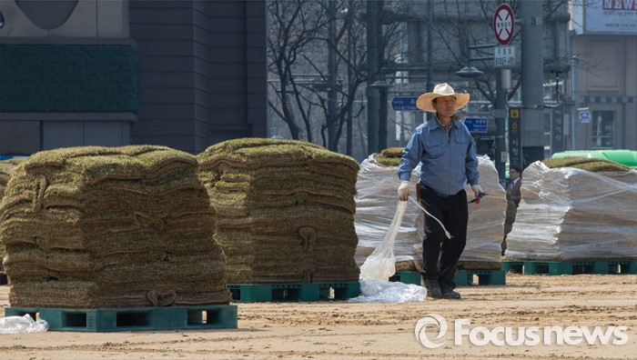 (서울=포커스뉴스) 22일 오후 서울시청 광장에 새봄맞이를 위한 잔디가 쌓여 있다.