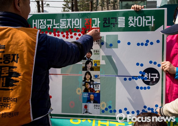 (서울=포커스뉴스) 22일 오전 서울시청 인근에서 열린 2016 비정규직 총선연대 발족식에 참석한 학교 비정규직 노동자가 각 정당 주요 총선 후보들을 평가하는 퍼포먼스를 하고 있다.