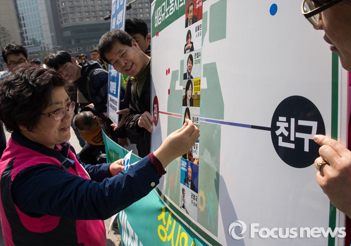 (서울=포커스뉴스) 22일 오전 서울시청 인근에서 열린 2016 비정규직 총선연대 발족식에 참석한 학교 비정규직 노동자가 각 정당 주요 총선 후보들을 평가하는 퍼포먼스를 하고 있다.