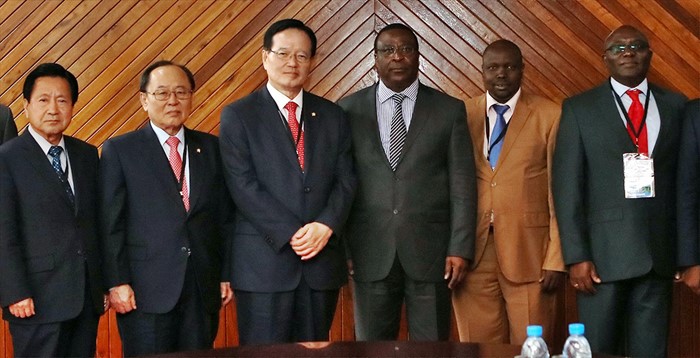 (서울=포커스뉴스) 정의화(왼쪽 세번째) 국회의장, 최봉홍(왼쪽 두번째) 새누리당 의원, 유승우(왼쪽 첫번째) 무소속 의원이 21일 오후(현지시각) 잠비아에서 열린 IPU(Inter-Parliamentary Union, 국제의회연맹) 총회에 참석해 케냐 대표단과 기념촬영을 하고 있다. <사진제공=국회>
