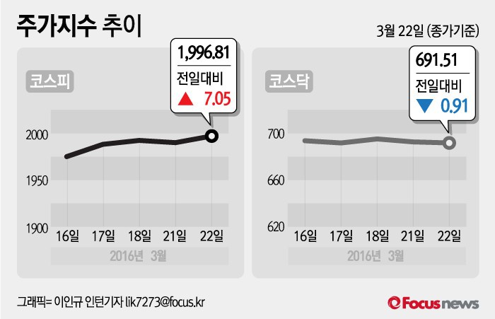 (서울=포커스뉴스) 22일 코스피지수는 전날 보다 0.35%(7.05포인트) 오른 1996.81에 장을 마쳤다. 코스닥지수는 전일 대비 0.13%(0.91포인트) 내린 691.51에 마감했다.