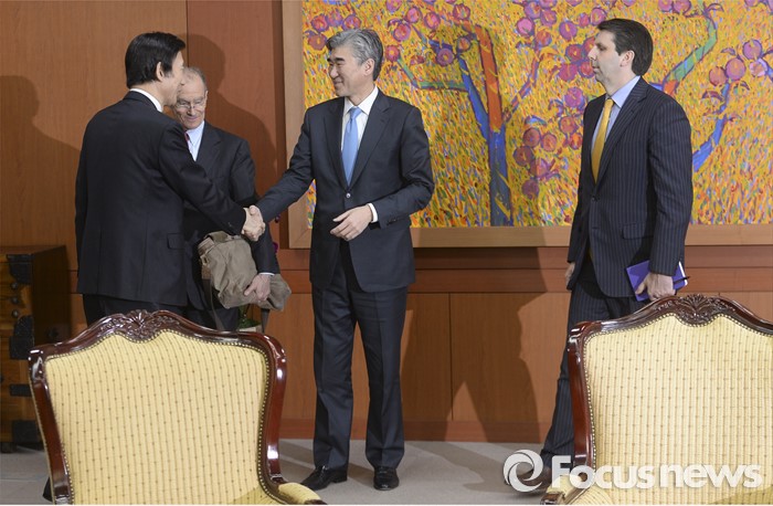 (서울=포커스뉴스)윤병세(왼쪽) 외교부 장관이 22일 오후 서울 종로구 외교부 청사에서 성김(왼쪽 세번째) 미 대북정책 특별대표, 대니얼 프리드(왼쪽 두번재) 제재정책조정관, 마크 리퍼트 주한미국 대사를 접견, 인사를 하고 있다.
