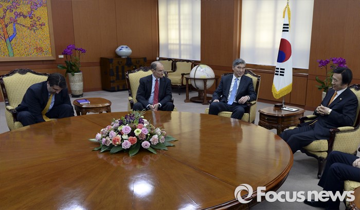 (서울=포커스뉴스)윤병세 외교부 장관이 22일 오후 서울 종로구 외교부 청사에서 성김(오른쪽 두번째) 미 대북정책 특별대표, 대니얼 프리드(오른쪽 세번째) 제재정책조정관, 마크 리퍼트 주한미국 대사를 접견하고 있다.