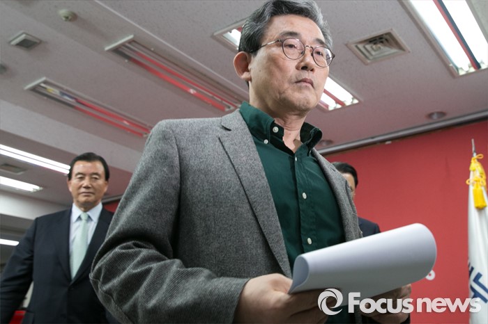 (서울=포커스뉴스) 이한구(앞) 새누리당 공천관리위원장이 22일 오후 서울 여의도 당사 기자실에서 4.13 총선 비례대표 후보자 발표를 마친 뒤, 단상을 내려오고 있다.