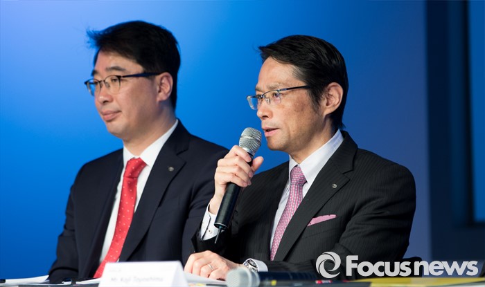 (서울=포커스뉴스) 22일 오전 서울 중구 웨스틴 조선호텔에서 요시다 아키히사(오른쪽) 한국토요타 사장이 신형 4세대 프리우스 발표회에 참석해 취재진 질문에 답하고 있다.