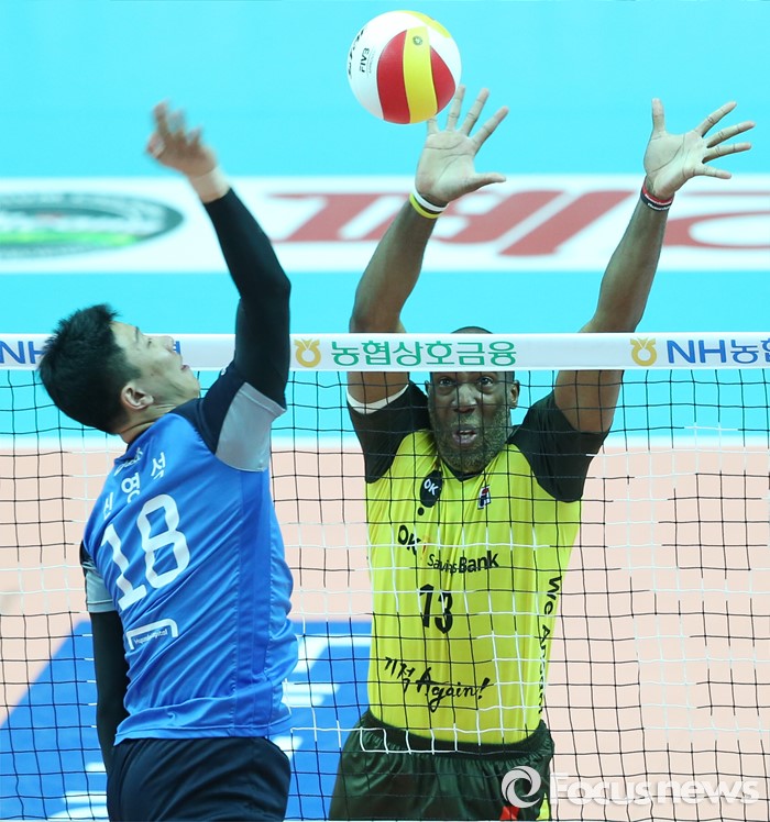 (안산=포커스뉴스) 22일 안산상록수체육관에서 열린 2015-2016 V-리그 남자부 챔피언결정전 3차전 OK저축은행-현대캐피탈 경기에서 현대캐피탈 신영석이 OK저축은행 시몬의 블로킹을 앞에 두고 공격을 하고 있다.