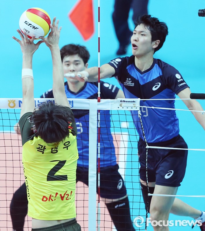 (안산=포커스뉴스) 22일 안산상록수체육관에서 열린 2015-2016 V-리그 남자부 챔피언결정전 3차전 OK저축은행-현대캐피탈 경기에서 OK저축은행 곽명우가 현대캐피탈 박주형의 연타 공격을 블로킹으로 막고 있다.