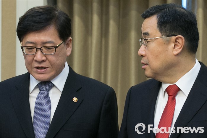 (서울=포커스뉴스) 김정훈(오른쪽) 새누리당 정책위의장과 정진엽 보건복지부 장관이 23일 오전 서울 여의도 국회에서 열린 지카바이러스 관련 긴급당정협의에 참석해 대화하고 있다.