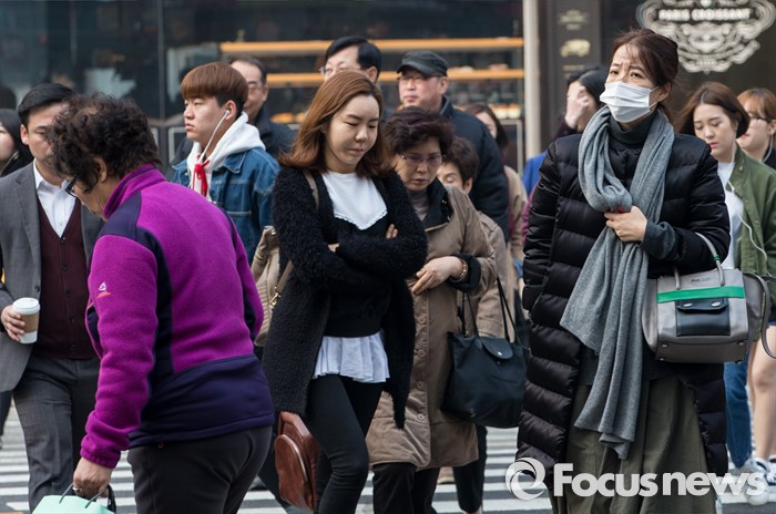 (서울=포커스뉴스) 꽃샘추위가 찾아온 23일 오전 서울 강남역 인근에서 두터운 옷차림의 시민들이 출근길을 재촉하고 있다. 기상청은 오후부터 기온이 점차 떨어지겠고 바람도 약간 강하게 불어 쌀쌀하겠으니 건강관리에 유의할 것을 당부했다.