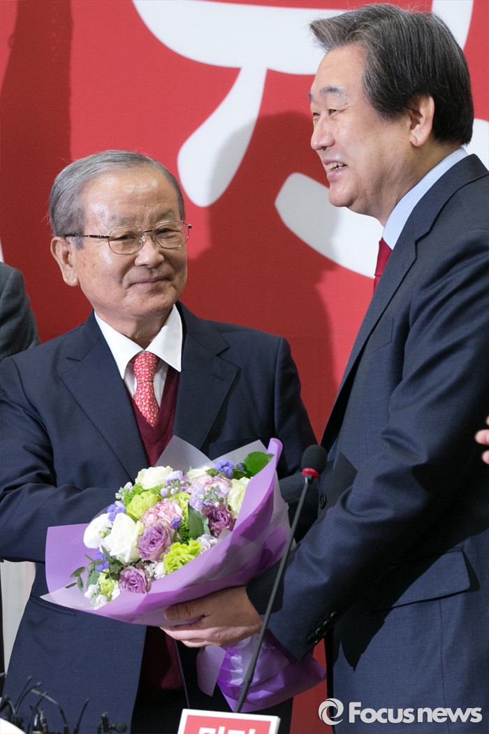 (서울=포커스뉴스) 김무성(오른쪽) 새누리당 대표가 23일 오전 서울 여의도 국회에서 열린 최고위원회의에 참석해 강봉균 공동선대위원장에게 꽃다발을 주며 악수하고 있다.