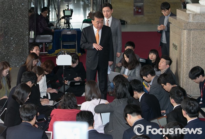 (서울=포커스뉴스) 23일 오전 서울 여의도 국회 로텐더홀에서 김성수 더불어민주당 대변인이 김종인 비대위 대표 거취 등 비공개 회의 결과를 기다리는 취재진에게 브리핑을 하고 있다.