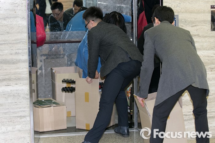 (서울=포커스뉴스) 국민의당 당직자들이 23일 오전 서울 여의도 국회에서 공천장 수여식 비품을 당사로 급히 옮기고 있다. 이날 국회에서 열릴 예정이었던 공천장 수여식은 공천 탈락 후보들의 반발로 당사에서 진행됐다.