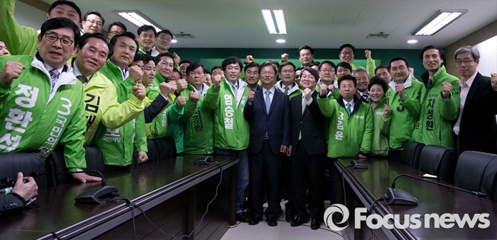 (서울=포커스뉴스) 안철수 국민의당 상임공동대표와 천정배 공동대표가 23일 오전 서울 마포구 당사에서 열린 20대 총선 공천장 수여식에 참석해 예비후보들과 함께 파이팅을 외치며 포즈를 취하고 있다. 국민의당은 이날 국회 본청에서 공천장 수여식 행사를 진행하려고 했지만, 공천에서 탈락한 김승남 의원 등 지지자들의 여론조사 관련 항의에 급하게 장소를 옮겨 진행했다.