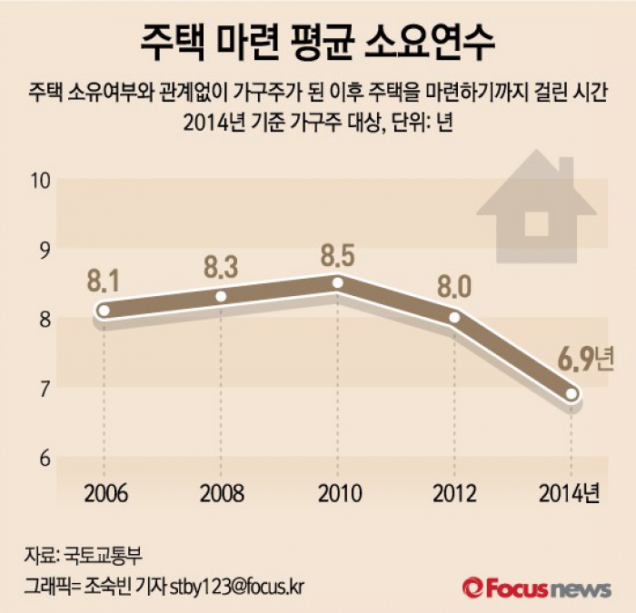 (서울=포커스뉴스) 23일 통계청이 발표한 ‘2015년 한국의 사회지표’에 따르면 2014년 기준 주택 소유여부와 관계없이 가구주가 된 이후 주택을 마련한 평균 소요연수는 6.9년으로 2012년 8.0년에 비해 약 1년 단축됐다.
