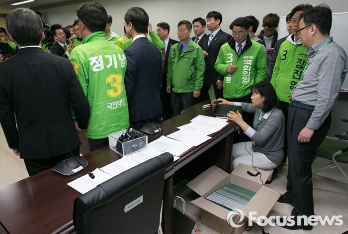 (서울=포커스뉴스) 안철수 국민의당 상임공동대표와 천정배 공동대표가 23일 오전 서울 마포구 당사에서 열린 20대 총선 공천장 수여식에 참석해 예비후보들과 기념촬영을 하고 있는 동안 뒷자리의 당직자들이 공천장 준비를 하고 있다. 국민의당은 이날 국회 본청에서 공천장 수여식 행사를 진행하려고 했지만, 공천에서 탈락한 김승남 의원 등 지지자들의 여론조사 관련 항의에 급하게 장소를 옮겨 진행했다.