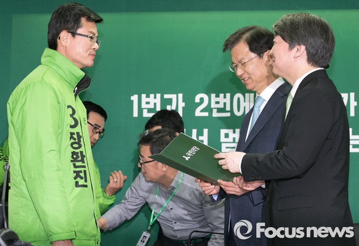 (서울=포커스뉴스) 안철수(오른쪽 첫번째) 국민의당 상임공동대표와 천정배(오른쪽 두번째) 공동대표가 23일 오전 서울 마포구 당사에서 열린 20대 총선 공천장 수여식에 참석해 장환진(서울 동작갑) 예비후보에게 공천장을 수여하고 있다. 국민의당은 이날 국회 본청에서 공천장 수여식 행사를 진행하려고 했지만, 공천에서 탈락한 김승남 의원 등 지지자들의 여론조사 관련 항의에 급하게 장소를 옮겨 진행했다.