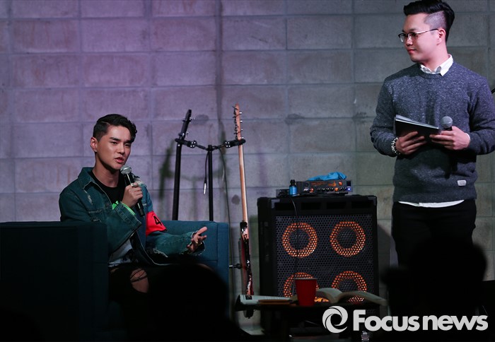 (서울=포커스뉴스) 23일 오후 서울 강남구 JBK 컨벤션홀에서 가수 딘(왼쪽)이 첫번째 정규앨범 [130 mood : TRBL] 발표 기자간담회에 참석해 취재진의 질문에 답하고 있다.