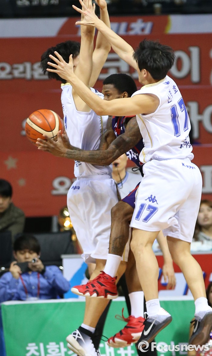 반면 KCC는 27점을 올리며 양팀 통틀어 최다 득점을 올렸다. 하지만 전태풍과 힐이 각각 10점씩을 올렸을 뿐 다른 선수들의 도움이 거의 없었다. 하승진은 15리바운드를 잡아냈지만 7점에 그치며 득점에서의 아쉬움이 컸다.(고양=포커스뉴스) 23일 고양체육관에서 열린 2015-2016 프로농구 챔피언결정전 3차전 오리온-KCC경기에서 오리온 조 잭슨이 KCC 송교창과 신명호의 샌드위치 마크 속에서 패스하고 있다.2016.03.23 우정식 기자