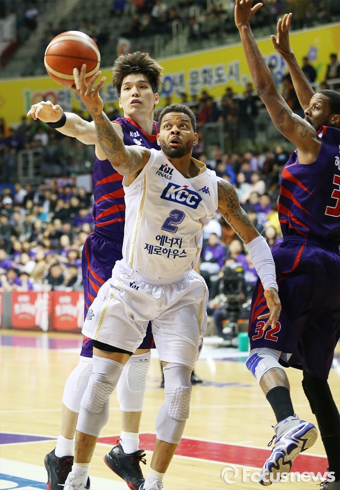 (고양=포커스뉴스) 23일 고양체육관에서 열린 2015-2016 프로농구 챔피언결정전 3차전 오리온-KCC경기에서 KCC 에밋이 오리온 장재석과 헤인즈의 수비 사이를 뚫으며 레이업슛을 시도하고 있다.