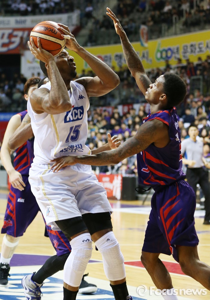 (고양=포커스뉴스) 23일 고양체육관에서 열린 2015-2016 프로농구 챔피언결정전 3차전 오리온-KCC경기에서 오리온 조 잭슨이 KCC 허버트 힐을 마크하고 있다.