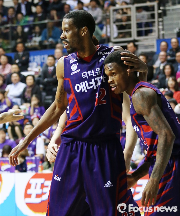 (고양=포커스뉴스) 23일 고양체육관에서 열린 2015-2016 프로농구 챔피언결정전 3차전 오리온-KCC경기에서 오리온 헤인즈가 슈팅을 시도하다 파울을 얻어낸 조 잭슨의 머리를 껴 안고 있다.