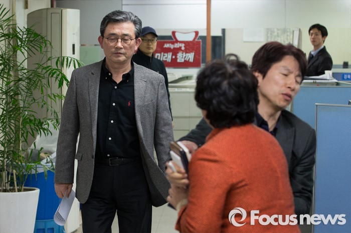 (서울=포커스뉴스) 이한구 공천관리위원장이 23일 오후 서울 영등포구 새누리당사에서 비례대표 공천결과를 브리핑하기 위해 이동하던 중 공천에 항의하는 당원이 당직자에게 제지를 당하고 있다.