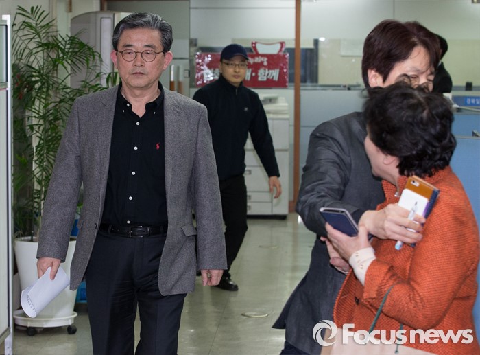(서울=포커스뉴스) 이한구 공천관리위원장이 23일 오후 서울 영등포구 새누리당사에서 비례대표 공천결과를 브리핑하기 위해 이동하던 중 공천에 항의하는 당원이 당직자에게 제지를 당하고 있다.