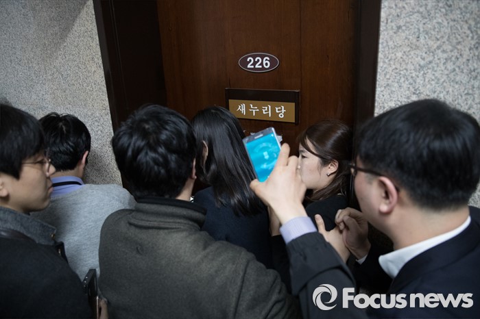 (서울=포커스뉴스) 23일 오후 서울 여의도 국회에서 열린 새누리당 최고위원회의장에서 고성이 들리자 취재진들이 출입문에 붙어 소리를 듣고 있다.