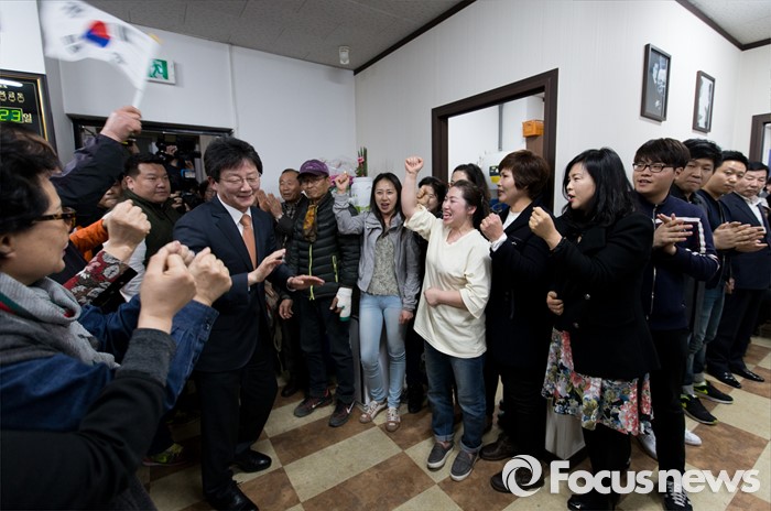 (대구=포커스뉴스) 유승민 의원이 23일 오후 대구 동구 용계동 사무소에서 새누리당 탈당 및 무소속 출마 기자회견에 앞서 지지자들과 악수를 나누고 있다.