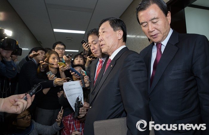 (서울=포커스뉴스) 황진하 새누리당 사무총장(공관위 부위원장)이 24일 새벽 서울 여의도 국회에서 열린 최고위원회의를 마치고 취재진의 질문에 답변을 하고 있다.