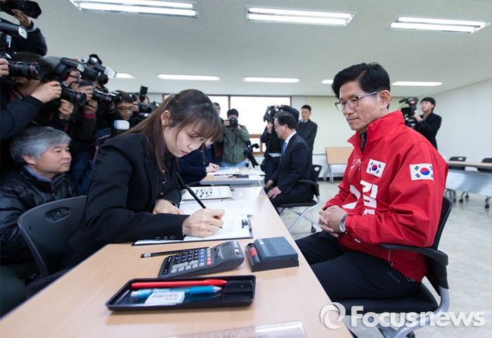 (대구=포커스뉴스) 24일 오전 대구 수성구 선거관리위원회에서 김문수(오른쪽) 새누리당 전 의원과 김부겸 더불어민주당 전 의원이 20대 총선 국회의원 후보 등록을 하고 있다.