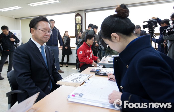 (대구=포커스뉴스) 24일 오전 대구 수성구 선거관리위원회에서 김문수 새누리당 전 의원과 김부겸 더불어민주당 전 의원이 20대 총선 국회의원 후보 등록을 하고 있다.