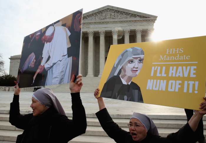 Caption:WASHINGTON, DC - MARCH 23: Nuns supporting Little Sisters of the Poor, attend a rally in front of the US Supreme Court, March 23, 2016 in Washington, DC. Today the high court heard arguments in Little Sisters v. Burwell, which will examine whether the governments new health care regulation will require the Little Sisters to change their healthcare plan, to other services that violate Catholic teaching. (Photo by Mark Wilson/Getty Images)