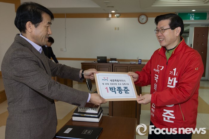 (세종=포커스뉴스) 제20대 국회의원 선거 후보자 등록 첫날인 24일 오전 세종시 조치원읍 세종시선거관리위원회에서 새누리당 박종준 후보가 등록 신청서를 제출하고 있다.