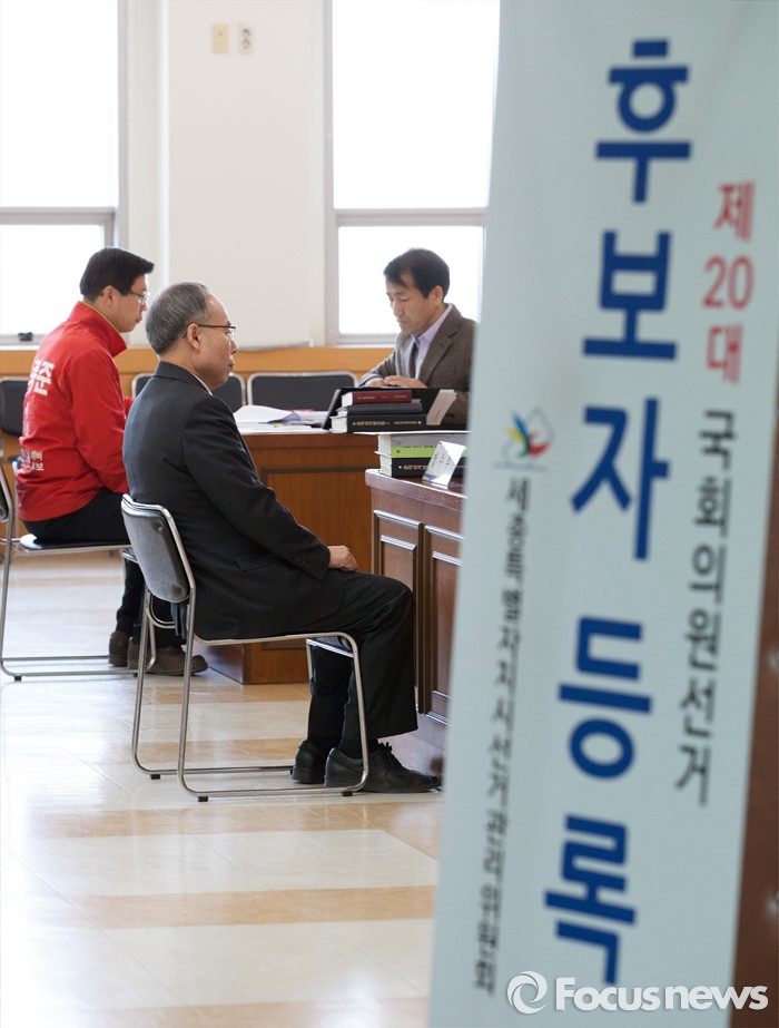 (세종=포커스뉴스) 제20대 국회의원 선거 후보자 등록 첫날인 24일 오전 세종시 조치원읍 세종시선거관리위원회에서 새누리당 박종준 후보와 무소속 이해찬 의원의 대리인이 후보 등록을 하고 있다.