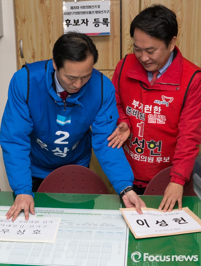(서울=포커스뉴스) 24일 오전 서울 서대문구 선거관리위원회에서 우상호(왼쪽) 더불러민주당 전 의원과 이성헌 새누리당 전 의원이 20대 총선 국회의원 후보 등록을 마친 후 기념촬영을 위해 서류를 정리하고 있다.