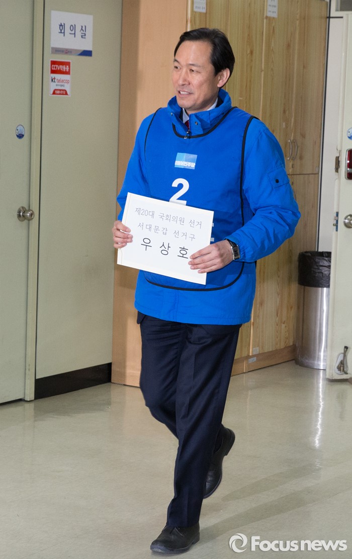 (서울=포커스뉴스) 24일 오전 서울 서대문구 선거관리위원회에서 우상호 더불러민주당 전 의원이 20대 총선 국회의원 후보 등록을 위해 들어서고 있다.