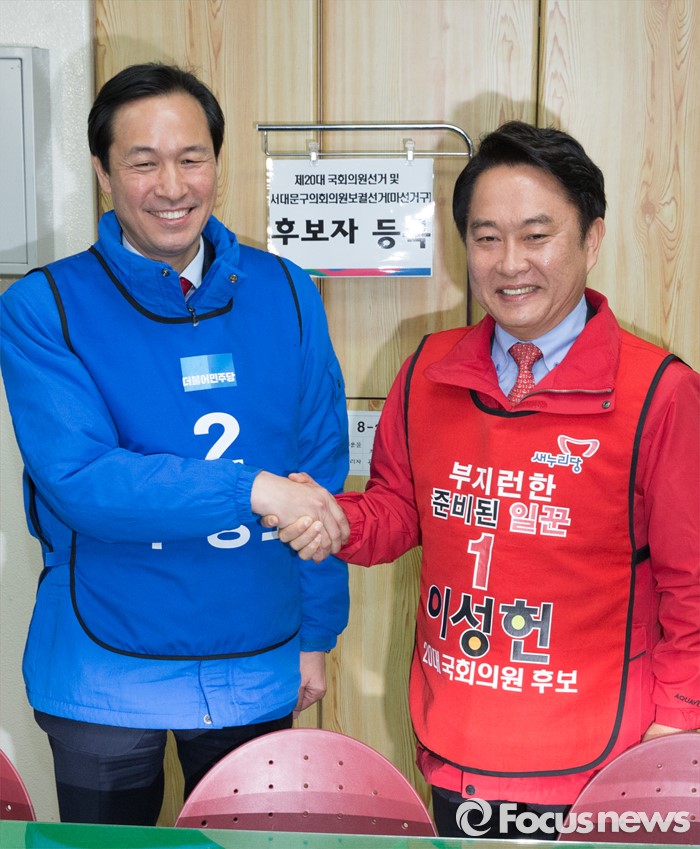 (서울=포커스뉴스) 24일 오전 서울 서대문구 선거관리위원회에서 우상호(왼쪽) 더불러민주당 전 의원과 이성헌 새누리당 전 의원이 20대 총선 국회의원 후보 등록 후 기념촬영하고 있다.