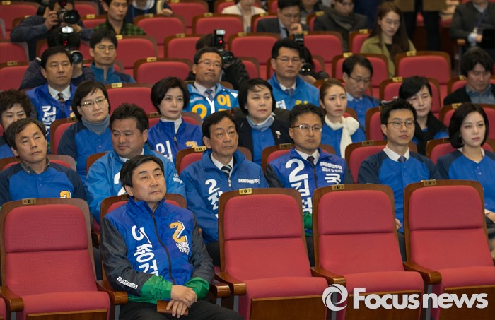 (서울=포커스뉴스) 이종걸 더불어민주당 원내대표 등 20대 총선 후보들이 24일 오전 서울 여의도 국회에서 공천장 수여식에 앞서 김종인 비대위 대표의 기자회견을 지켜보고 있다.