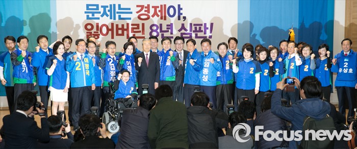 (서울=포커스뉴스) 김종인 더불어민주당 비대위 대표가 24일 오전 서울 여의도 국회에서 열린 20대 총선 공천장 수여식에 참석해 후보들과 함께 기념촬영을 하고 있다.