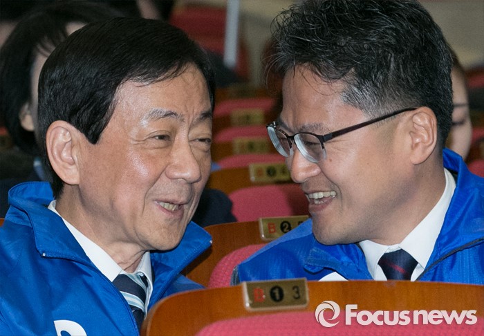 (서울=포커스뉴스) 새누리당을 탈당하고 더불어민주당에 입당한 진영(왼쪽) 의원이 24일 오전 서울 여의도 국회에서 열린 20대 총선 공천장 수여식에 참석해 김정우 경기 군포갑 후보와 대화하고 있다.