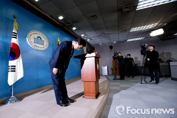 (서울=포커스뉴스) 20대 총선에서 새누리당 공천을 받지 못한 주호영(대구 수성을) 의원이 24일 오전 서울 영등포구 국회 정론관에서 무소속 출마 발표를 마친 뒤 인사 하고 있다.