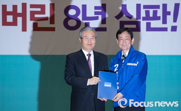 (서울=포커스뉴스) 김종인(왼쪽) 더불어민주당 비대위 대표가 24일 오전 서울 여의도 국회에서 공천장 수여식에 참석해 진영 의원(서울 용산)에게 공천장을 전달한 뒤 기념촬영을 하고 있다.