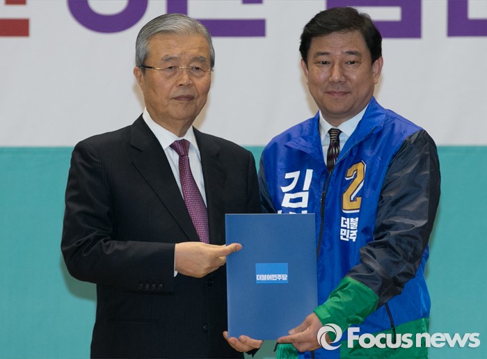 (서울=포커스뉴스) 김종인(왼쪽) 더불어민주당 비대위 대표가 24일 오전 서울 여의도 국회에서 공천장 수여식에 참석해 김병기 서울 동작갑 후보에게 공천장을 전달한 뒤 기념촬영을 하고 있다.