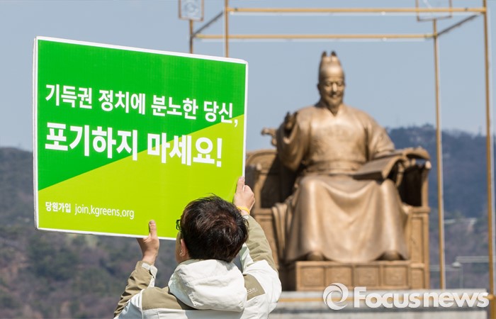 (서울=포커스뉴스) 24일 오전 서울 광화문광장에서 한 녹색당원이 선거 참여를 독려하는손 팻말을 들고 있다.
