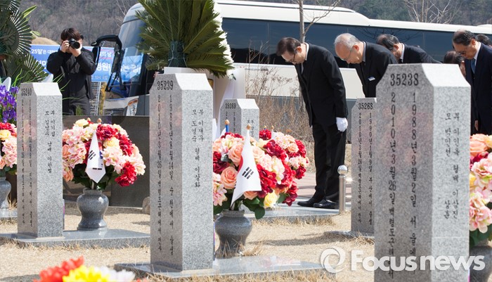 (대전=포커스뉴스) 이명박 전 대통령이 제1회 서해수호의날을 하루 앞둔 24일 오전 대전 유성구 국립대전현충원 천안함 46용사 묘역을 참배하고 있다.